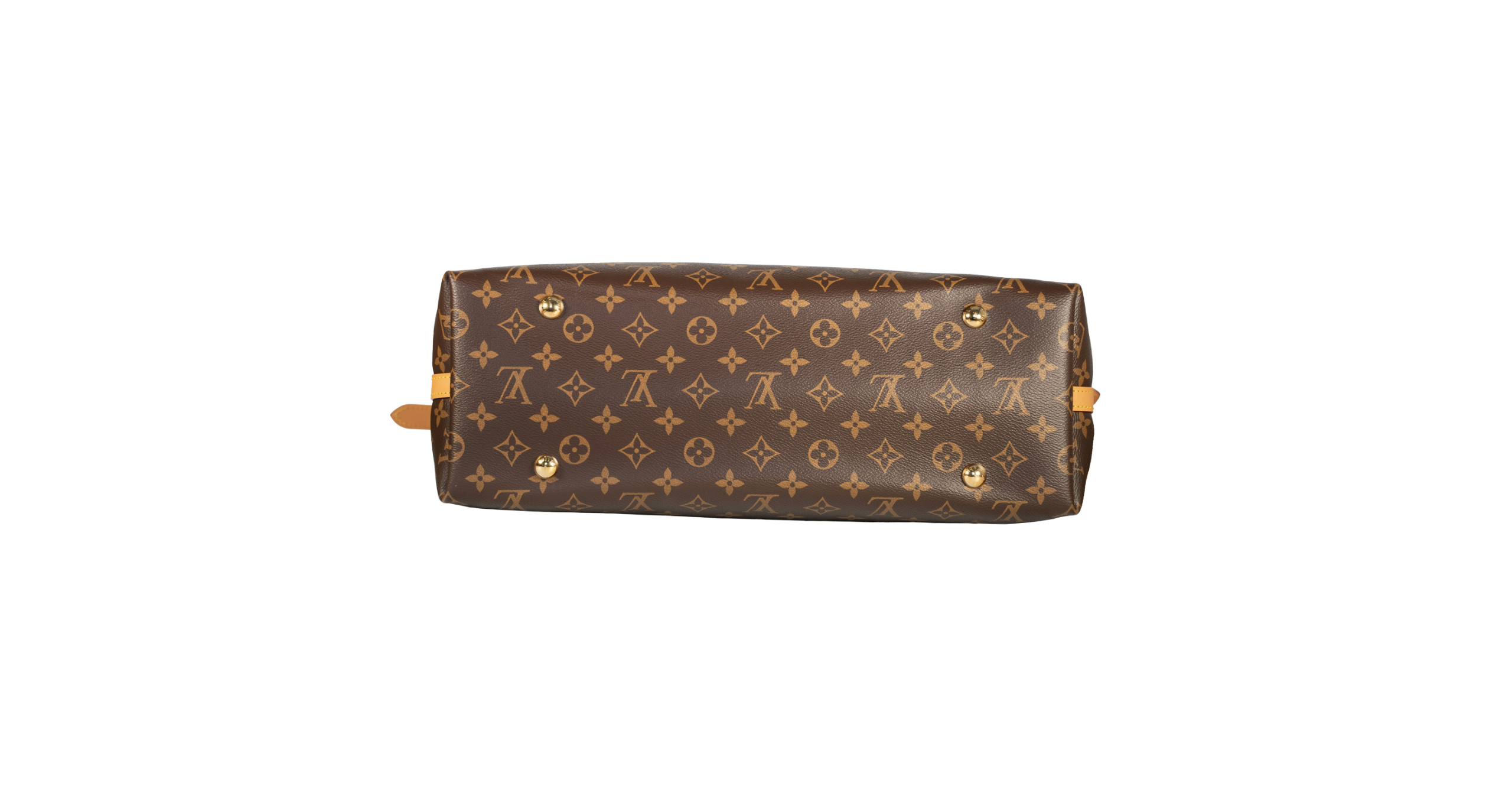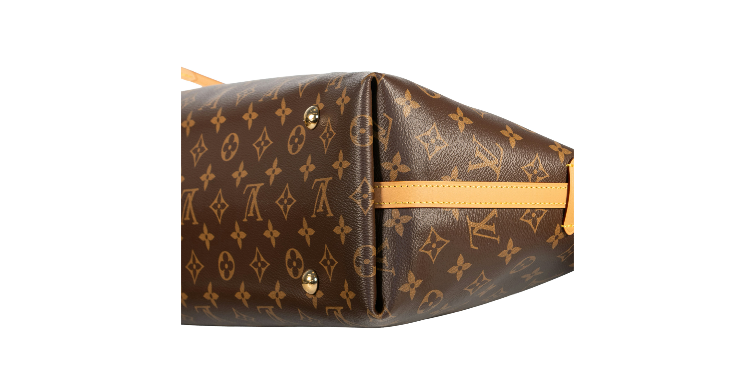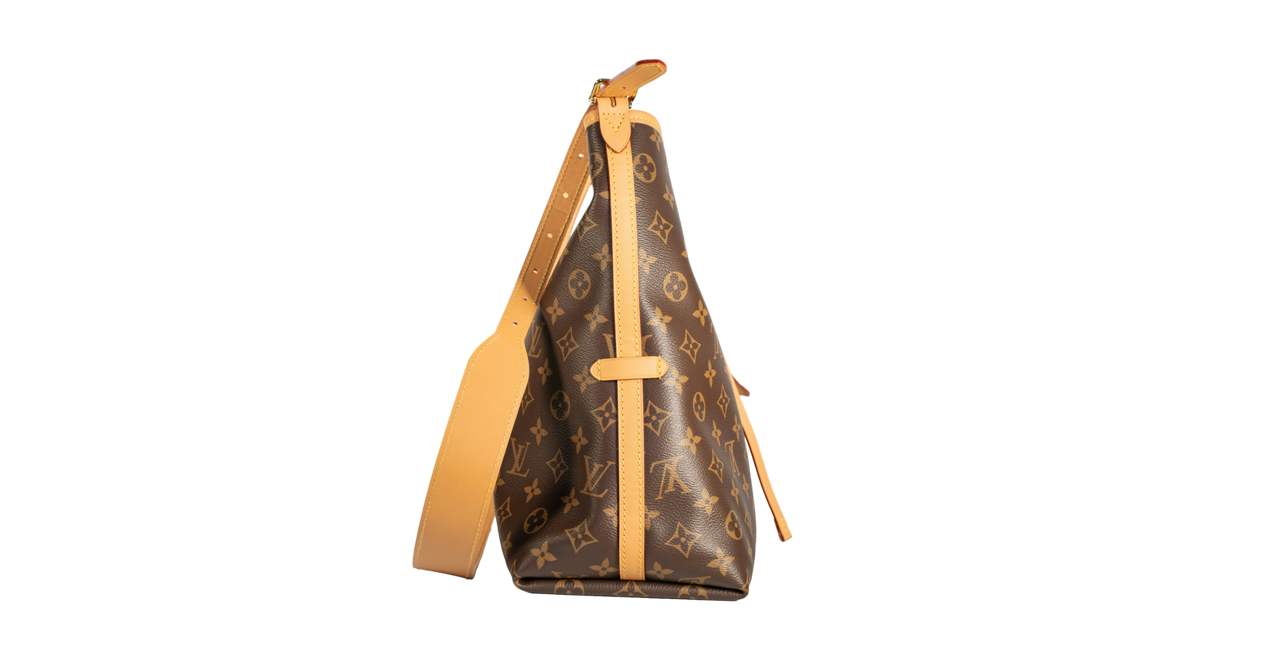 This is a Louis Vuitton CarryAll Hobo. It is brown monogram coated canvas with gold hardware. It is a size MM. It measures 16″x6″x12″. Drop: 13″-21″. It is in good condition. It includes luggage tag, duster, and detachable strap.